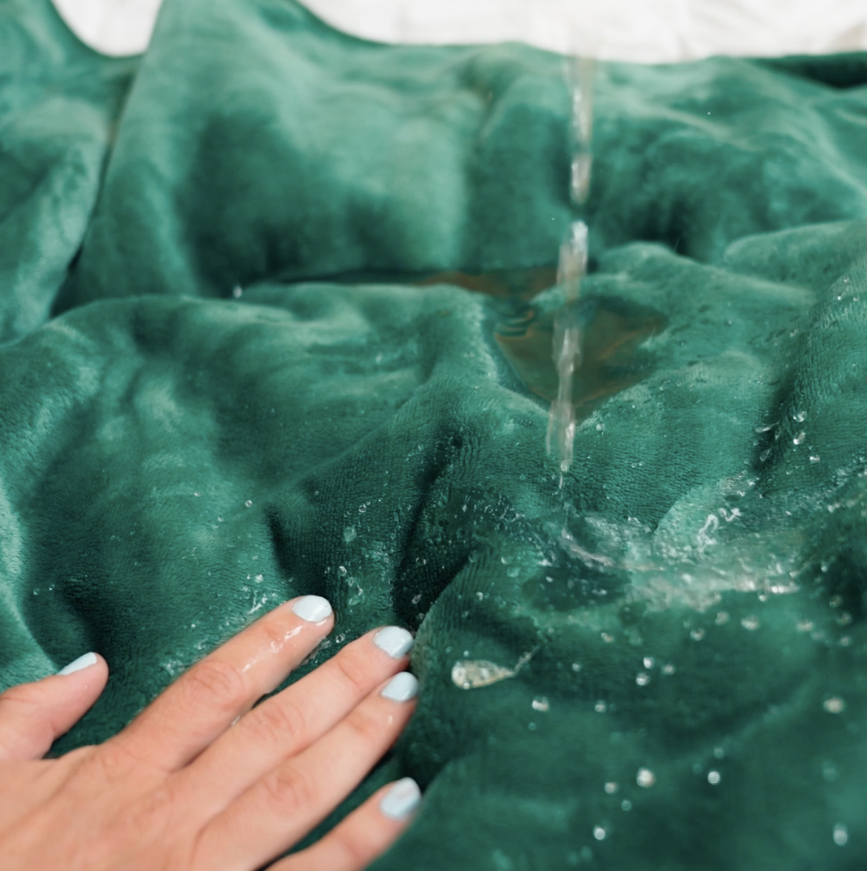 Tack vare det inre lagret av termoplastisk polyuretan (TPU) kan mattan stå emot vätskor och förhindra att den sipprar igenom till lakan och möbler. Faktum är att filten rymmer upp till 1 liter vätska, och beroende på storleken rymmer den till och med mycket mer. Till skillnad från andra vattentäta mattor, där vätskan ofta sitter ovanpå, sipprar vätskan in i Goddess-mattan, vilket gör att du kan njuta av mattan även när den är blöt. Dessutom är den fläckbeständig och idealisk för spotting, förlossning, postpartum och andra röriga aktiviteter.