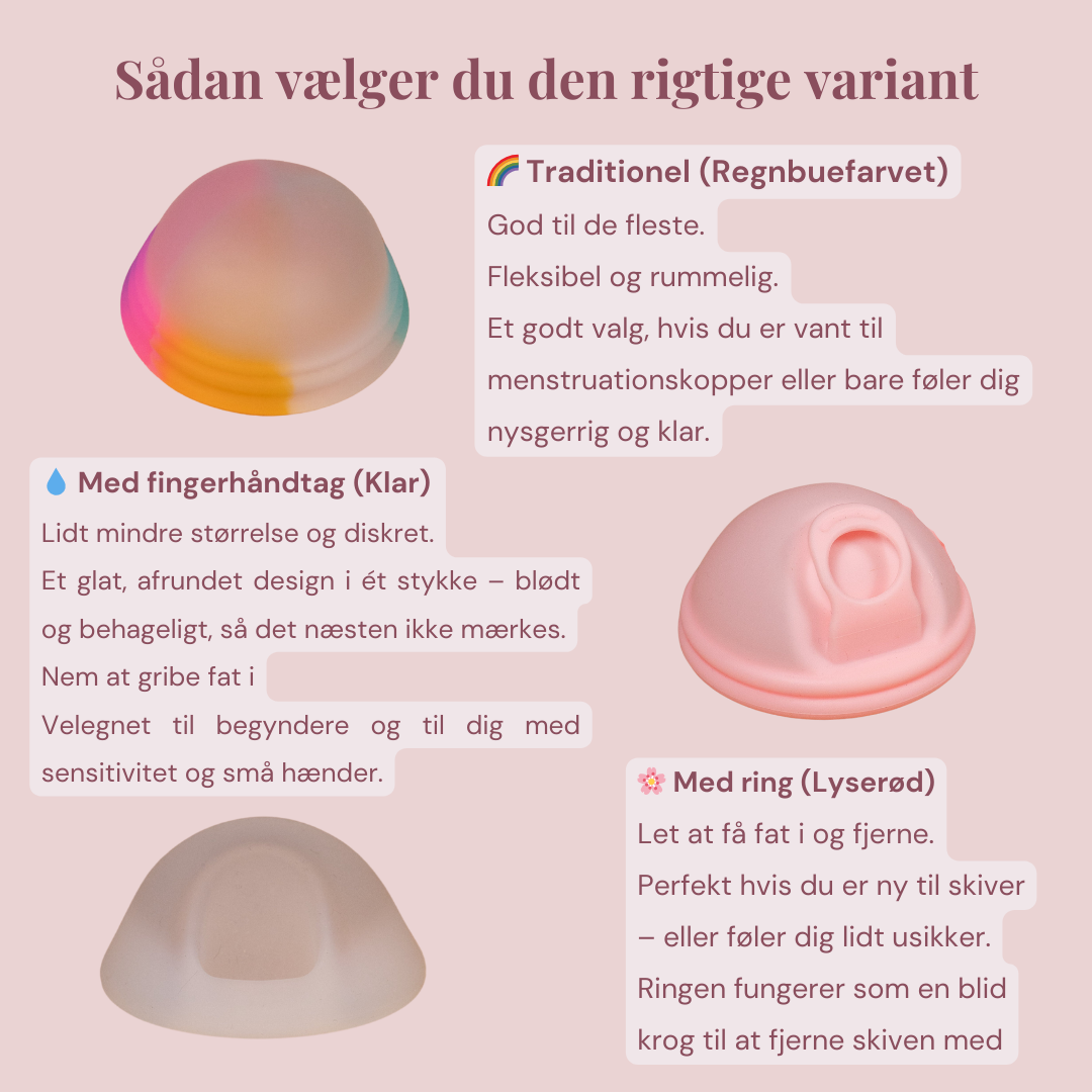 - En menstruationsskiva i 100% medicinsk silikon antingen i regnbågsfärg, traditionell, rosa med ring eller klar med fingerhandtag. Välj mellan en liten, stor eller båda storlekarna.