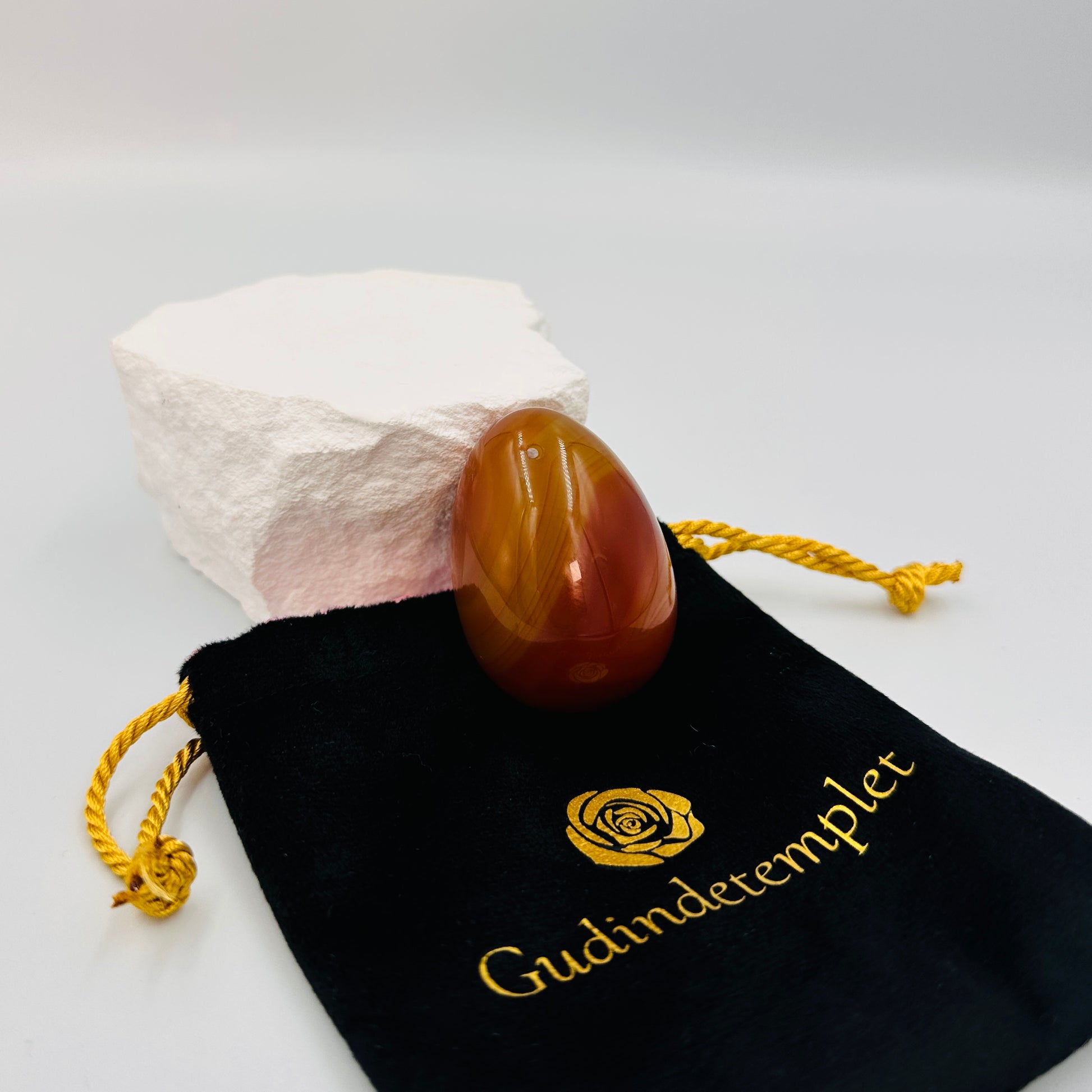 - Ett äkta karneol yoniägg, genomborrat i den tunna änden så att du kan sätta in ett snöre för avancerade övningar eller enkel borttagning